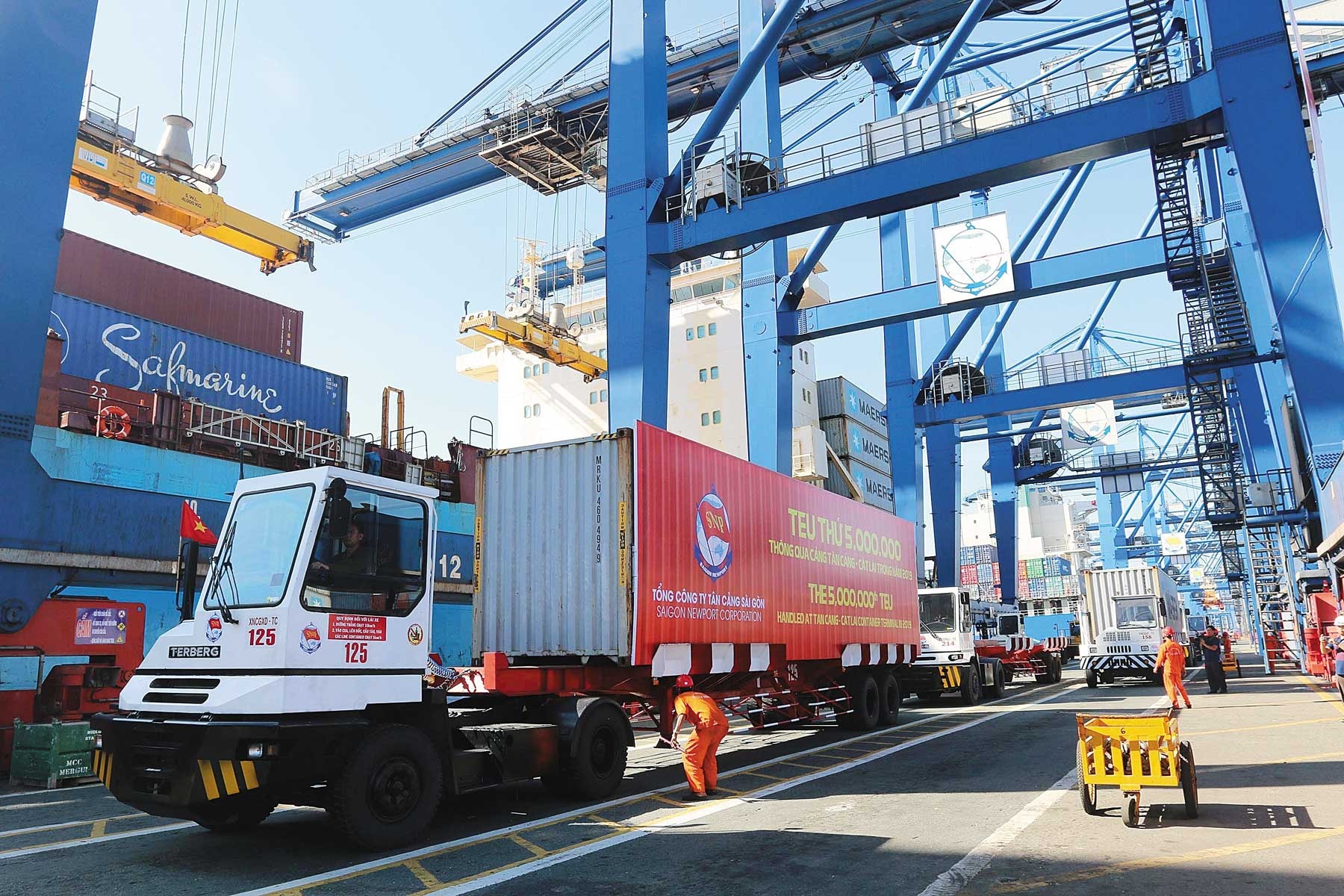 Bốc dỡ container hàng xuất - nhập khẩu tại Cảng Tân Cảng - Cát Lái, Thành phố Hồ Chí Minh_Ảnh: TTXVN