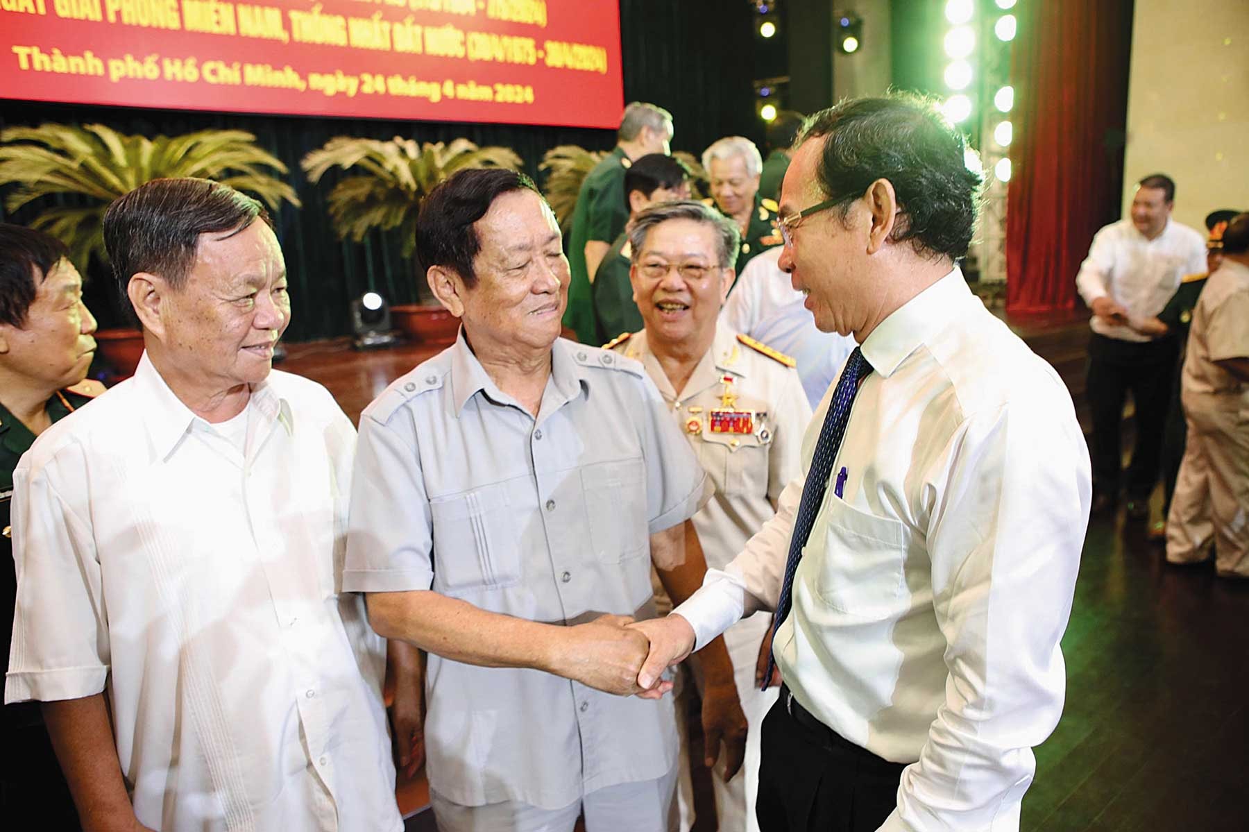 Ủy viên Bộ Chính trị, Bí thư Thành ủy Thành phố Hồ Chí Minh Nguyễn Văn Nên trò chuyện cùng các cán bộ lão thành cách mạng, tháng 4-2024_Ảnh: plo.vn
