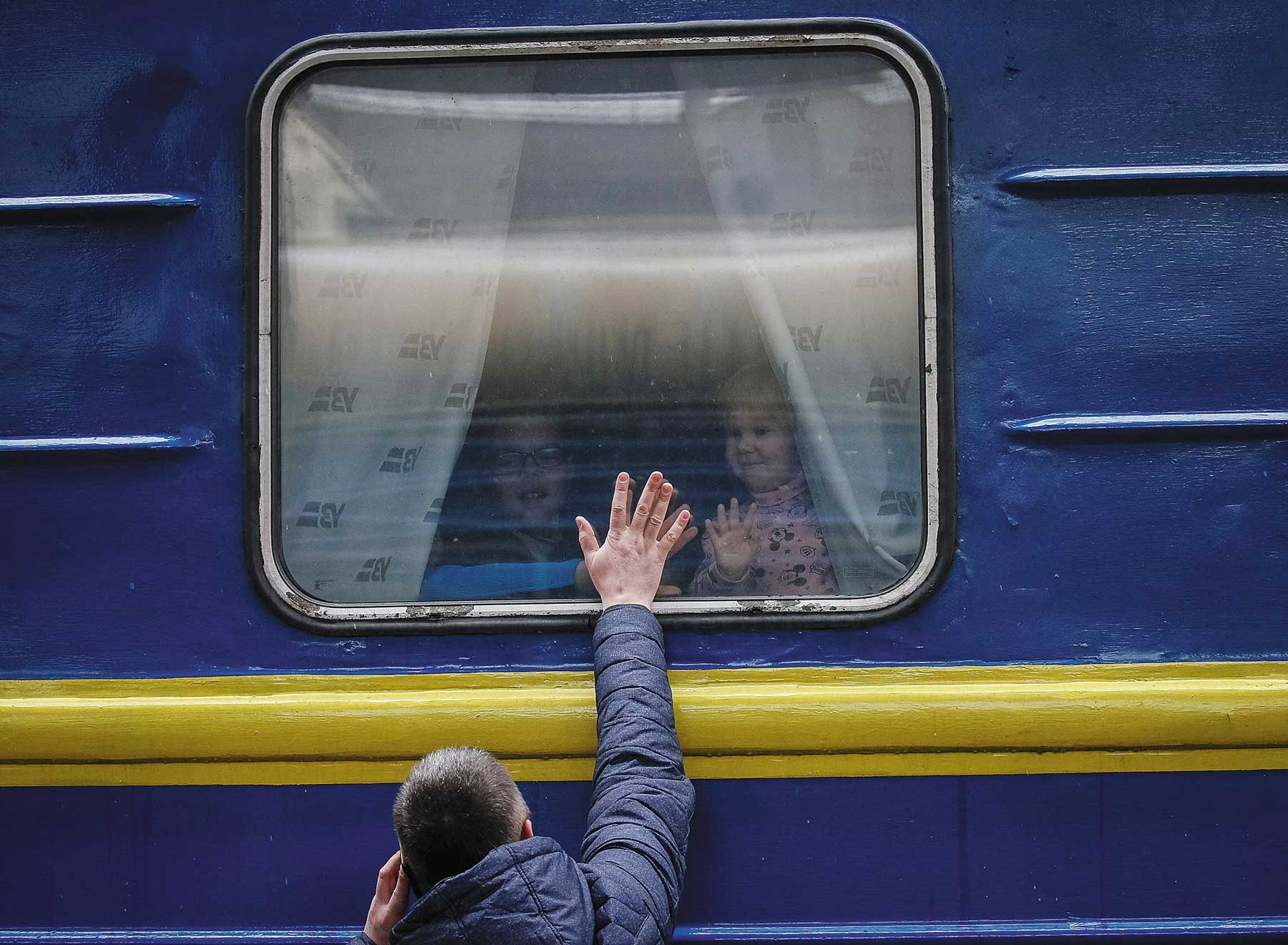 Trẻ em tạm biệt người thân lên tàu hỏa sơ tán tránh xung đột ở Thủ đô Kiev, Ukraina, ngày 3-3-2022_Ảnh: Reuters