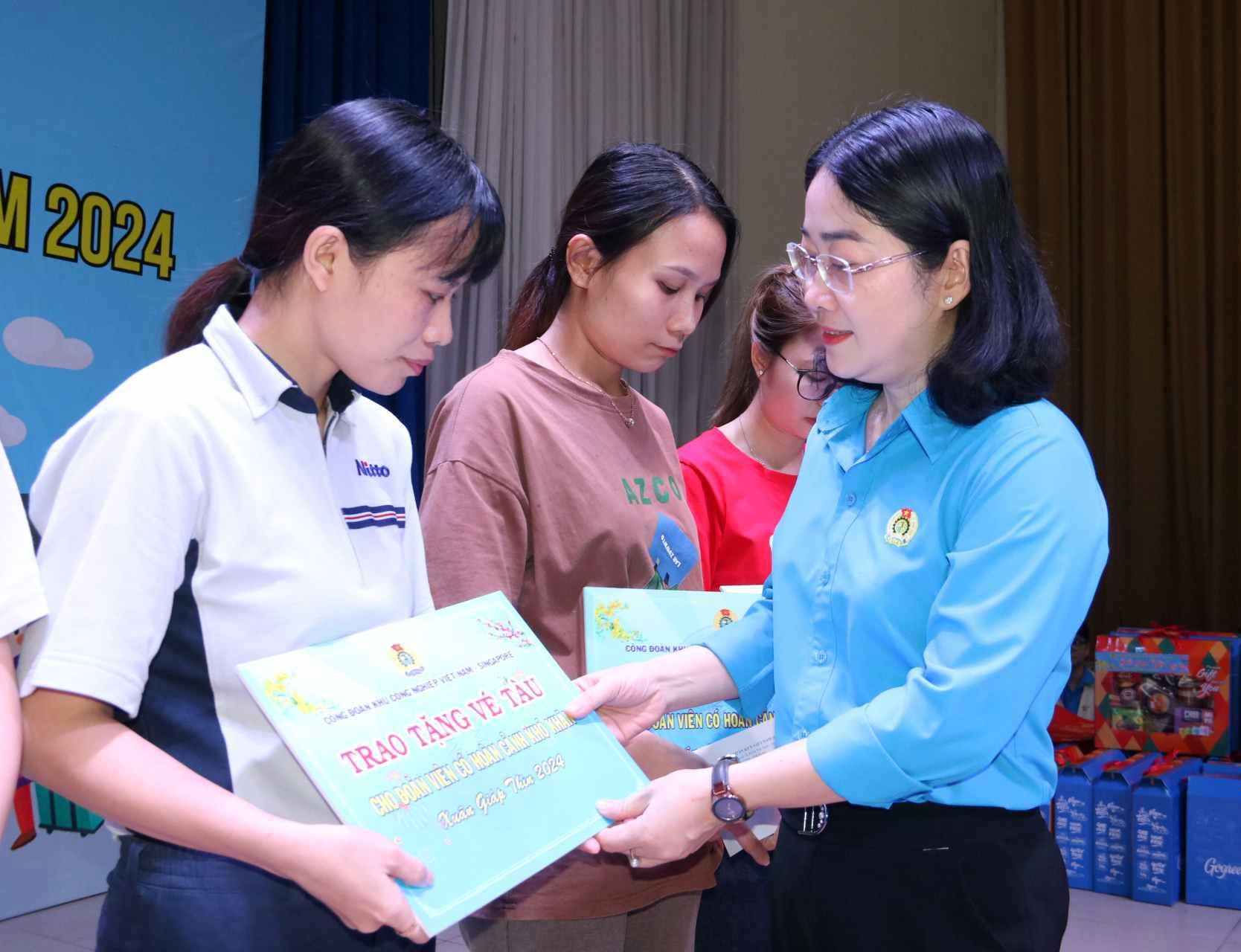 Chương trình còn tặng 5.000 phần quà cho công nhân lao động có hoàn cảnh khó khăn với tổng số tiền 2,5 tỷ đồng. Công đoàn VSIP hỗ trợ 778 vé xe cho đoàn viên, người lao động có hoàn cảnh khó khăn về quê đón tết và trao 182 vé tàu cho đoàn viên có hoàn cảnh khó khăn trong dịp Tết Nguyên đán Giáp Thìn 2024.