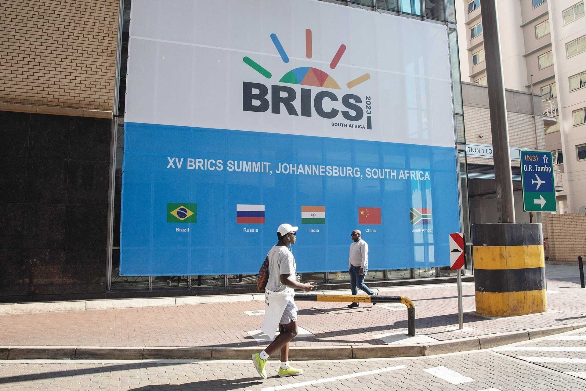 Thông báo về Hội nghị thượng đỉnh lần thứ 15 BRICS tại Trung tâm Hội nghị Sandton, Johannesburg, Nam Phi, ngày 20-8-2023_Ảnh: AFP