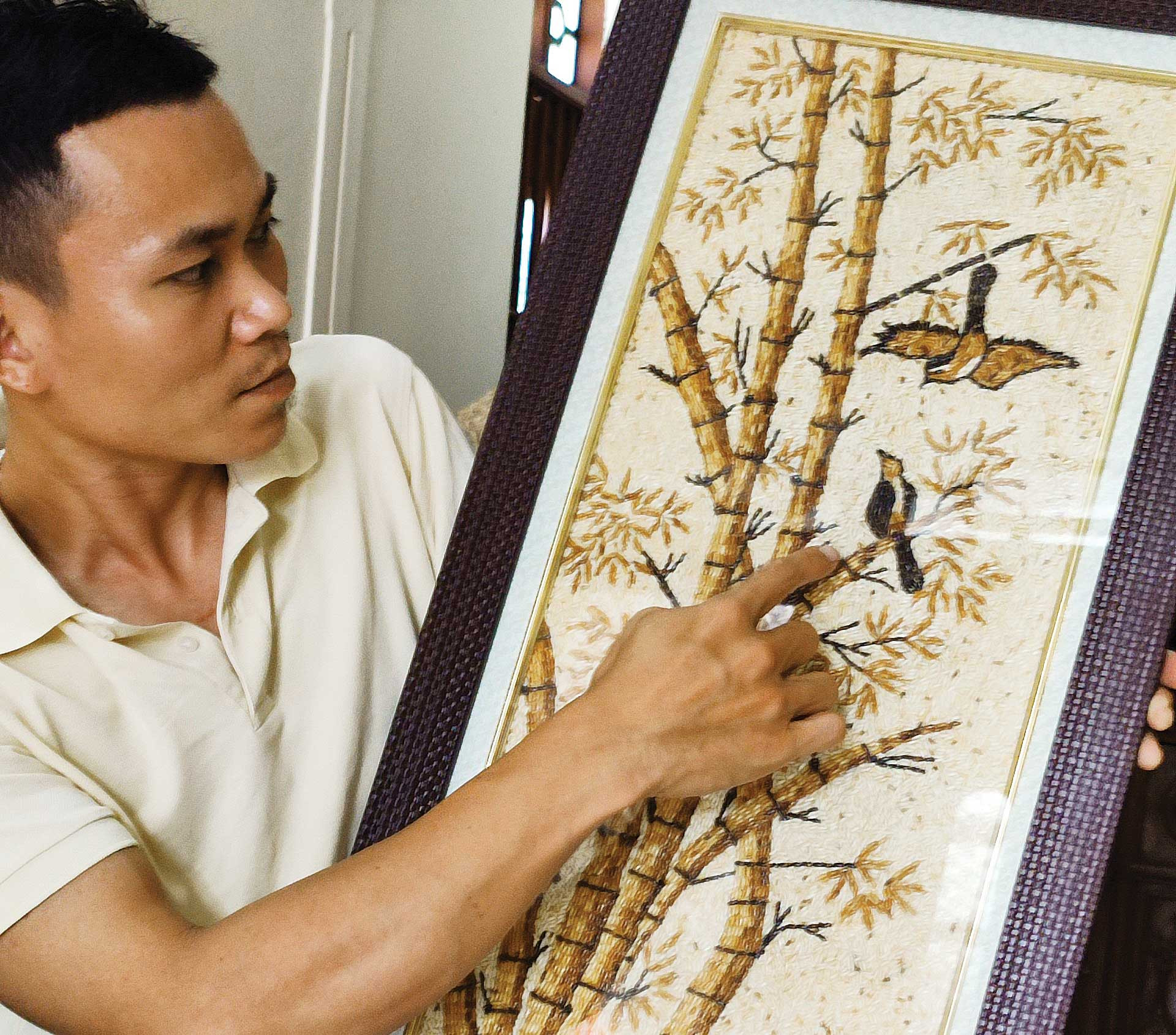 Tuân lại kể một chi tiết cảm động: “nhiều bạn trước khi vào nghề không nghĩ mình sẽ làm được việc gì chứ chưa nói đến chuyện “vẽ” được tranh gạo để bán kiếm tiền. Bạn Đoàn Đình Sinh ở xã Quảng Định, huyện Quảng Xương bị liệt cả hai chân từng than thân như thế, nhưng giờ thì bạn ấy “vẽ” tranh gạo khá đẹp”. Nói đến đó, Tuân cho tôi xem hình ảnh Đoàn Đình Sinh đang dồn tâm trí ngồi “vẽ” bức tranh gạo chữ “Tâm”.