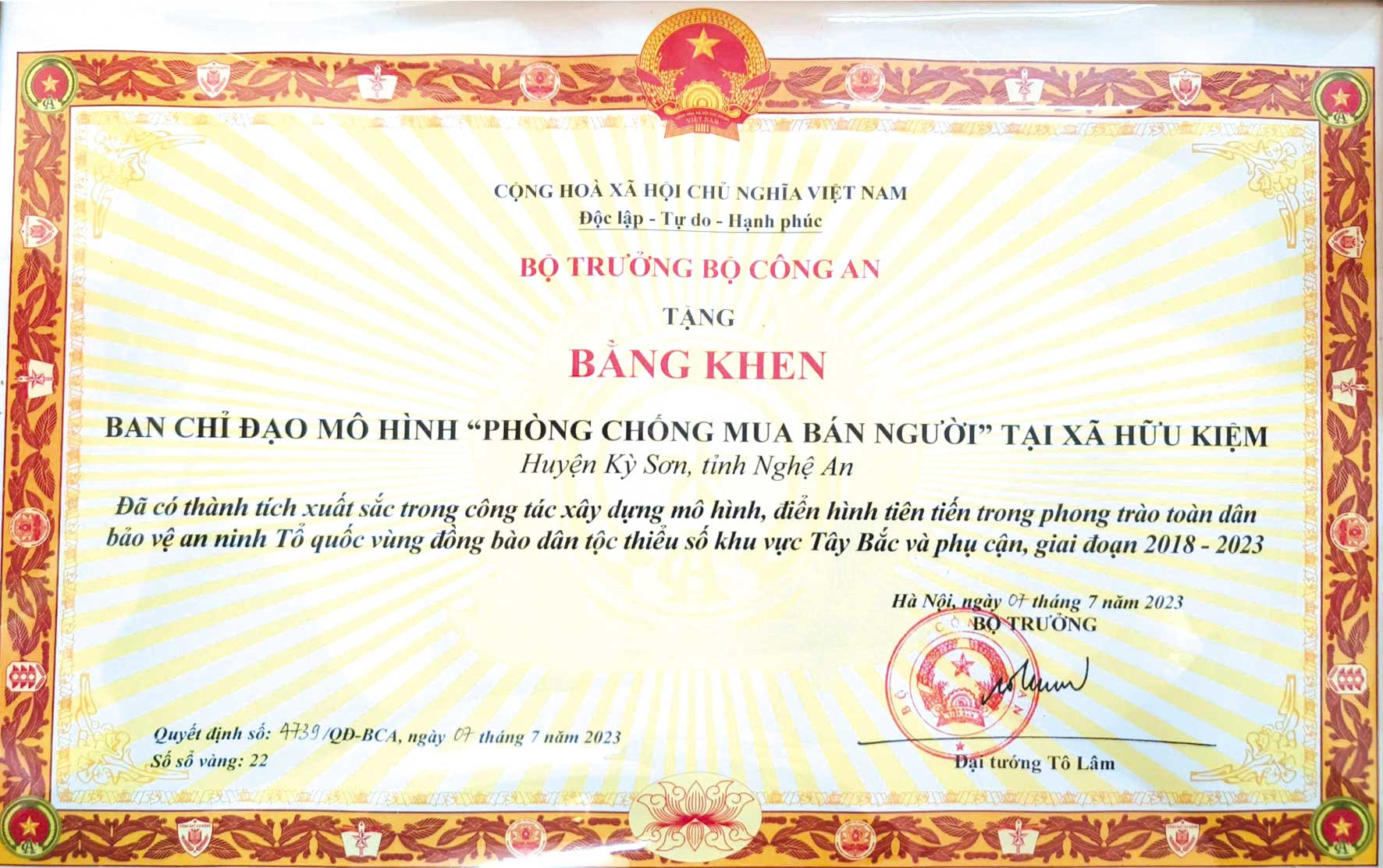 Mô hình hy hữu có tên “mô hình phòng chống mua bán người” ở 2 bản đặc biệt khó khăn của xã Hữu Kiệm, huyện Kỳ Sơn, tỉnh Nghệ An. Những câu chuyện sau đây sẽ giải thích vì sao mô hình lại hy hữu và hy hữu đến mức chỉ riêng có tại 2 bản của xã Hữu Kiệm. Mới đây, mô hình được Bộ Công an tặng Bằng khen.