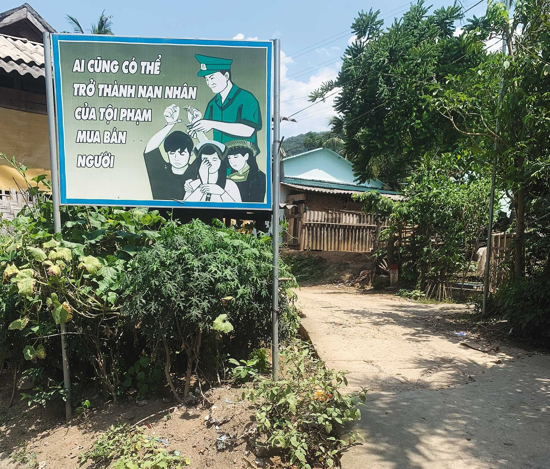 Nghe đến đây, chúng tôi mới hiểu vì sao ngay từ đường từ bản Bà bên quốc lộ 7 vào 2 bản Đỉnh Sơn 1 và Đỉnh Sơn 2 dựng tấm áp phích có hình ảnh một nam thanh niên đang giơ hai cánh tay trong chiếc còng số 8, bên cạnh là người phụ nữ đang rơi những giọt nước mắt... Đứng phía sau là chiến sĩ công an bên dòng chữ: “Ai cũng có thể trở thành nạn nhân của tội phạm mua bán người”.