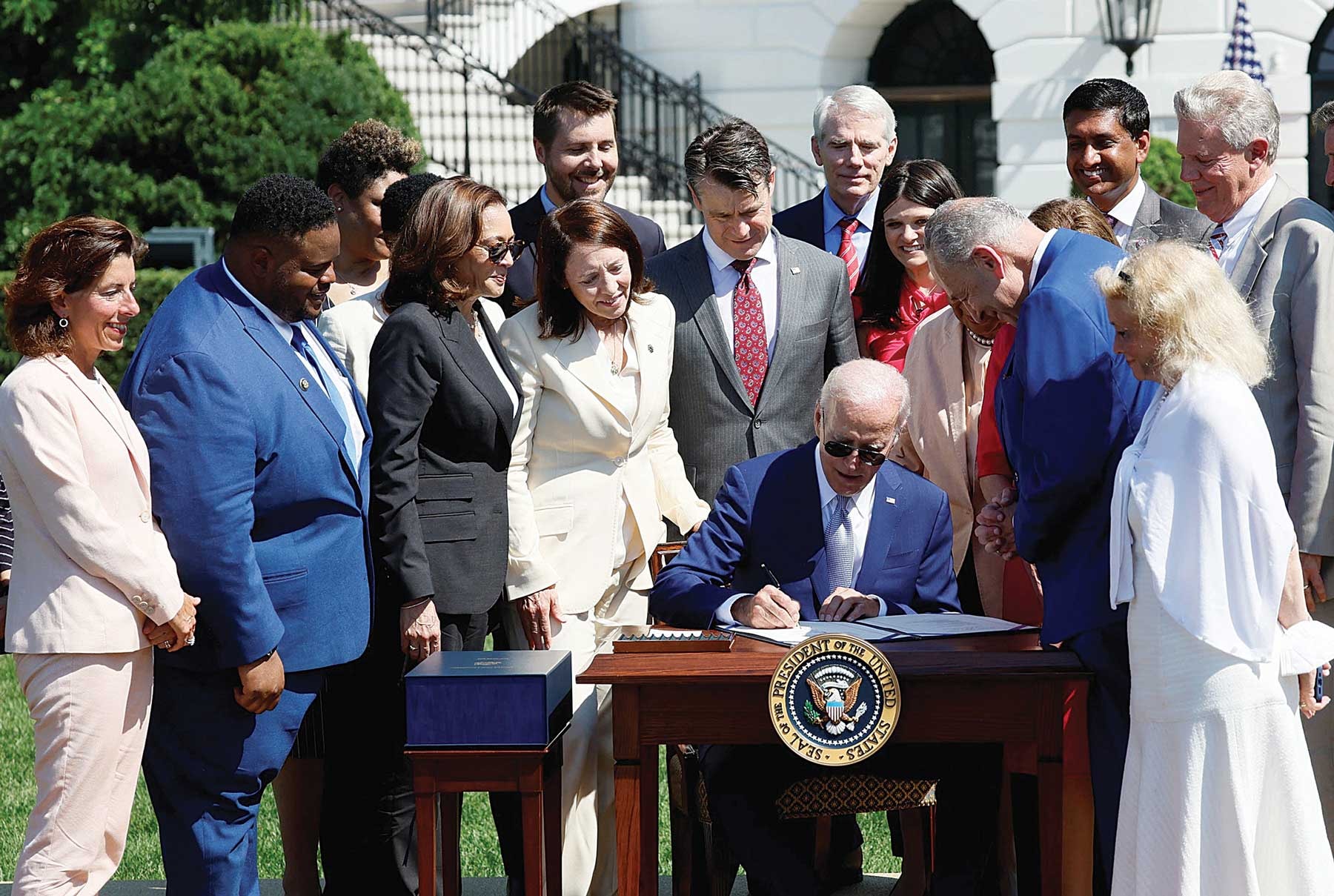 Năm 2022, Tổng thống Joe Biden ký ban hành Luật Chip và Khoa học, qua đó cung cấp khoảng 280 tỷ USD tài trợ để thúc đẩy nghiên cứu và sản xuất chất bán dẫn ở Mỹ. Cụ thể, đạo luật này quy định 39 tỷ USD trợ cấp cho việc sản xuất chip trên lãnh thổ Mỹ cùng với 25% tín dụng thuế đầu tư cho chi phí thiết bị sản xuất và 13 tỷ USD cho nghiên cứu chất bán dẫn và đào tạo lực lượng lao động.
