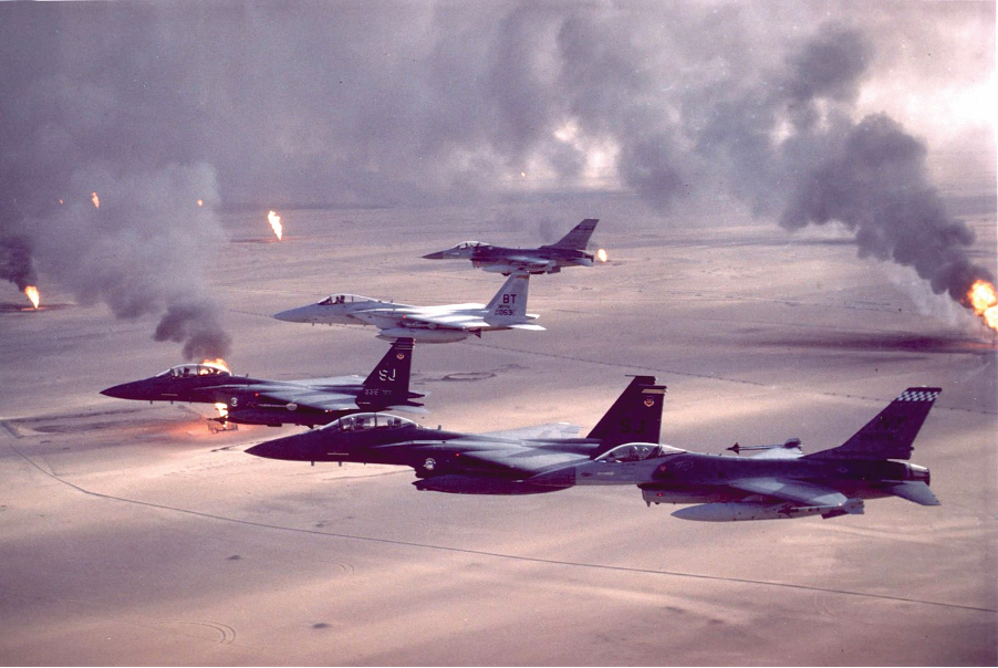 Máy bay chiến đấu F-16A, F-15C và F-15E bay trên các giếng dầu bị đốt cháy ở Kuwait trong “Chiến dịch Bão táp Sa mạc”_Ảnh: defense.gov