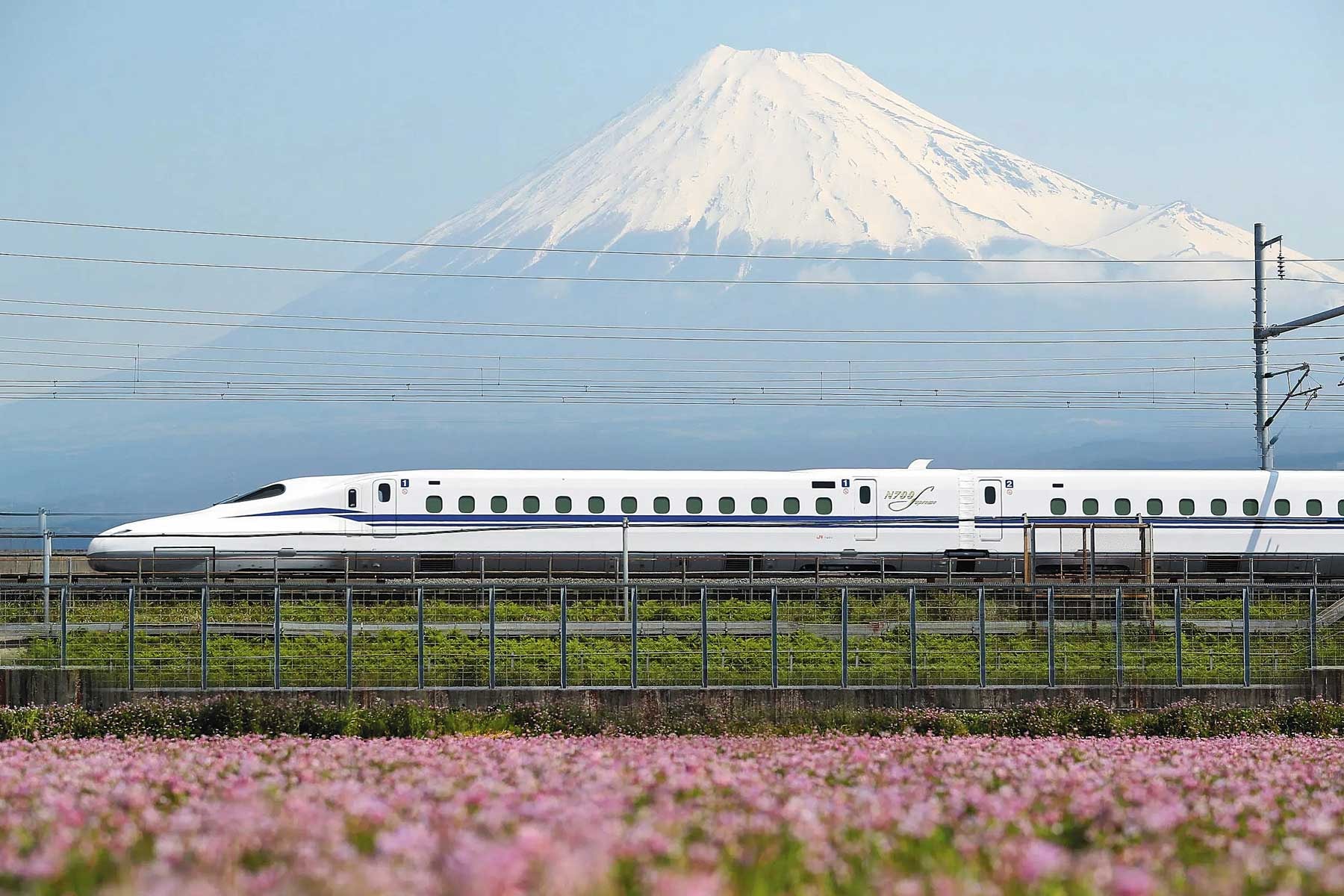 Một chuyến tàu Shinkansen chạy phía trước núi Phú Sĩ, Nhật Bản_Ảnh: AFP