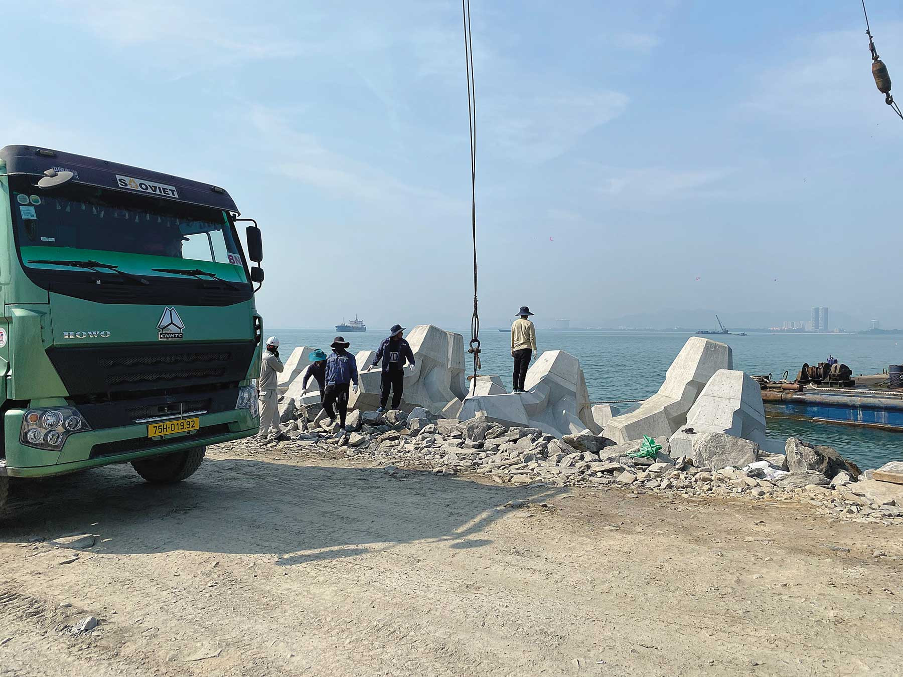 Khi cấu kiện đã được xếp ổn định, kỹ sư Nguyễn Văn Thiện cúi thấp người ngó nghiêng xuống đáy khối rakuna. Lát sau anh đứng dậy và giơ cánh tay phải thẳng lên trời báo hiệu hoàn thành. Dây cẩu được tháo bỏ, cánh tay cẩu lại từ từ di chuyển ra phía ngoài khơi. Công việc thật đơn giản và nhàn hạ.