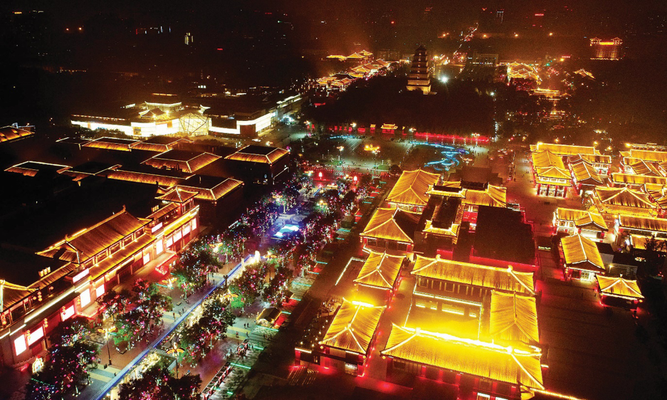 Trung tâm mua sắm Great Tang All Day Mall ở thành phố Tây An, tỉnh Thiểm Tây, Trung Quốc về đêm_Ảnh: TL