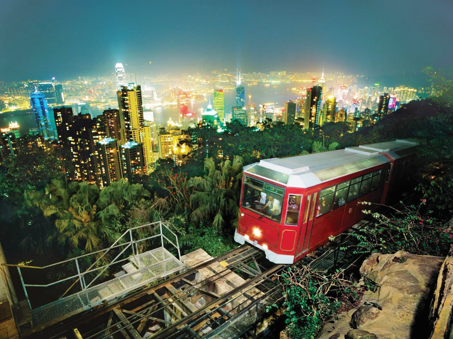 Khách du lịch trải nghiệm khung cảnh Hồng Kông (Trung Quốc) về đêm trên tàu điện lên đỉnh núi Thái Bình (Victoria Peak)_Ảnh: TL
