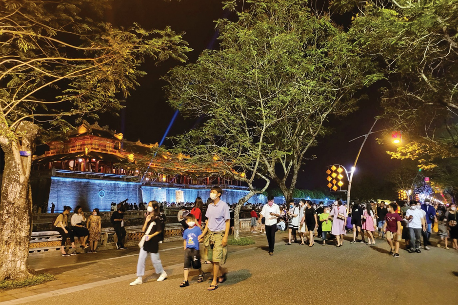 Phố đêm Hoàng thành Huế (tỉnh Thừa Thiên Huế) là sự kết hợp giữa phố đi bộ, các chương trình nghệ thuật, khu vực trưng bày, kinh doanh các sản phẩm nghề truyền thống độc đáo và ẩm thực Huế_Ảnh: thanhnien.vn