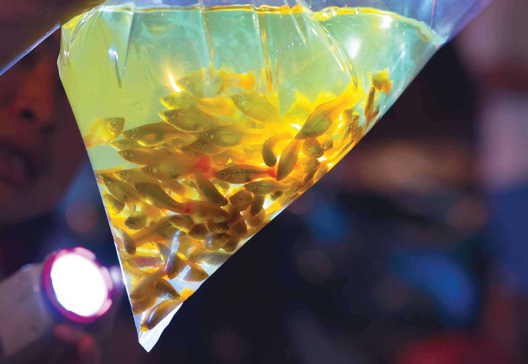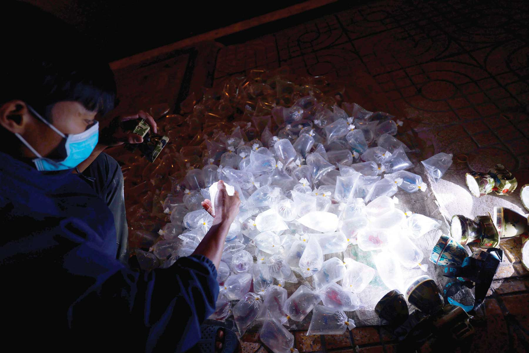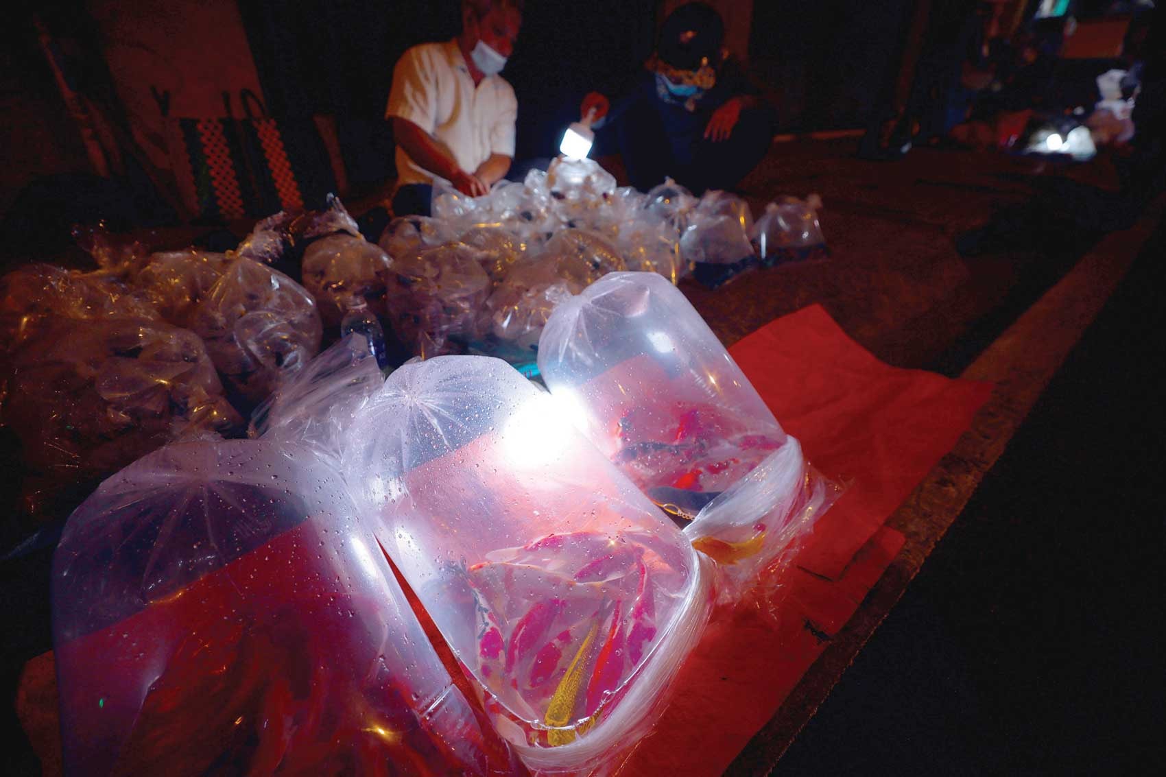 Cá được chứa trong các túi bóng, khi mua khách sẽ sử dụng đèn pin soi để đánh giá chất lượng của những chú cá trước khi xuống tiền.