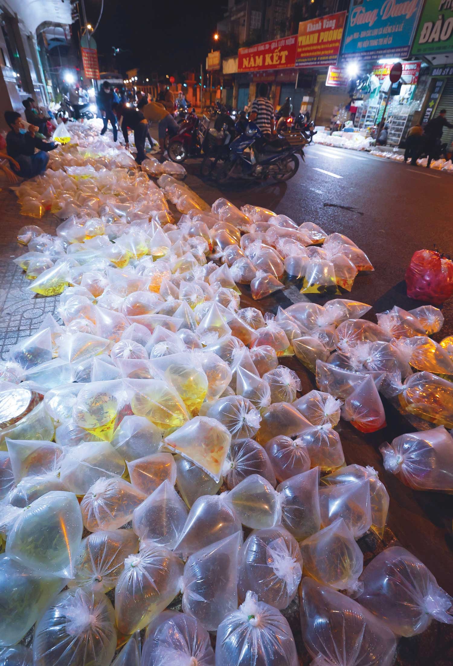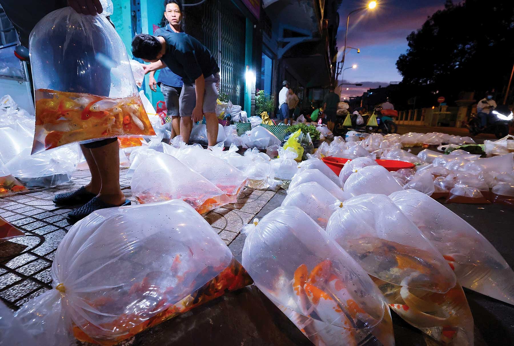 Đến 4 giờ sáng, khu vực vỉa hè và lề đường đoạn ngã ba Lưu Xuân Tín, Trần Hưng Đạo B gần như bị phủ kín bởi các túi cá cảnh.