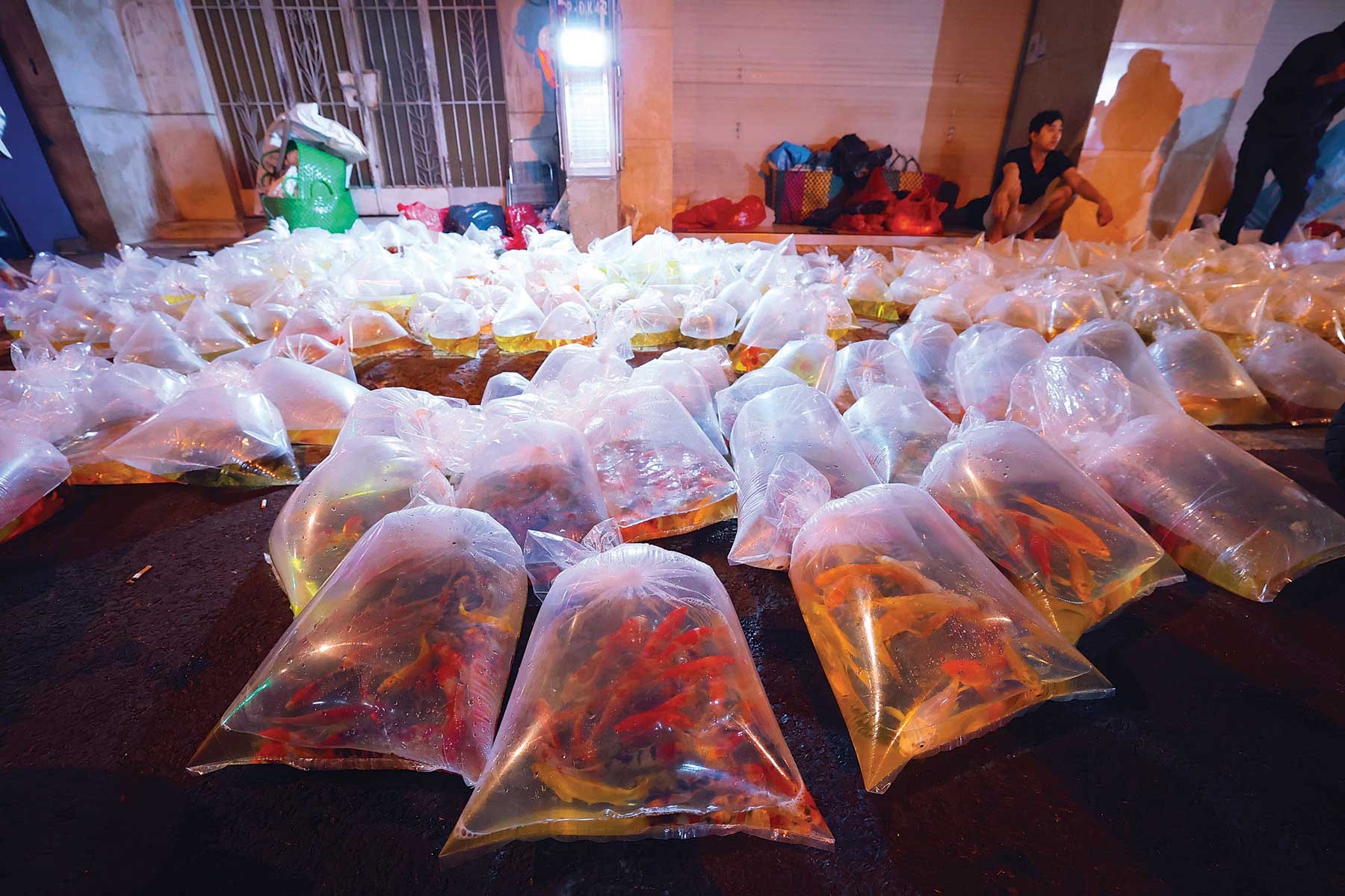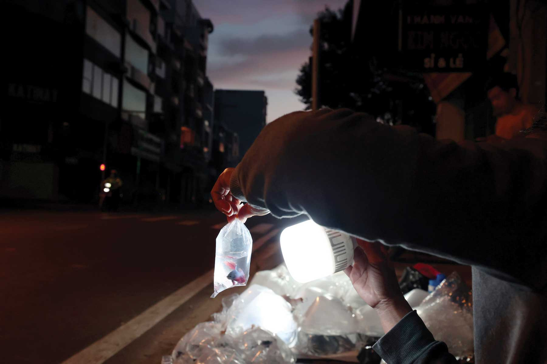 Dưới ánh đèn lờ mờ của đường phố về đêm, hàng chục loại cá cảnh được tiểu thương bày bán trên vỉa hè.