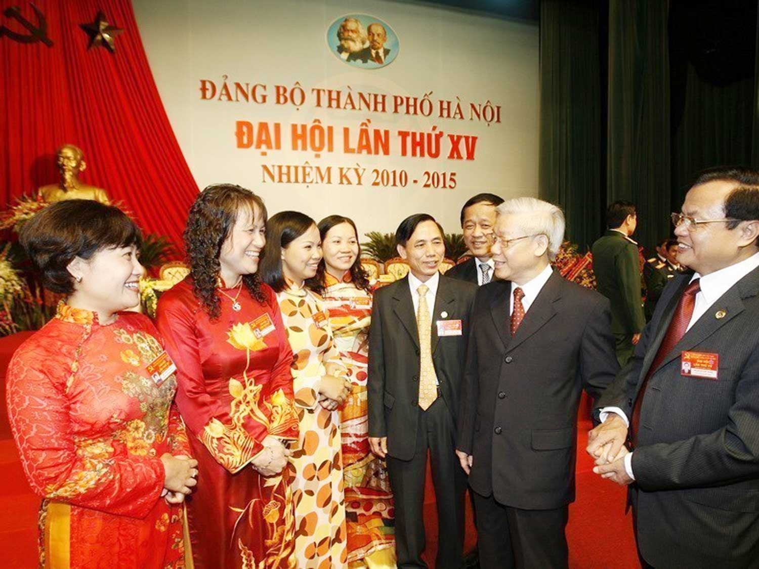 Chủ tịch Quốc hội Nguyễn Phú Trọng trò chuyện với đại biểu dự Đại hội đại biểu Đảng bộ thành phố Hà Nội lần thứ XV, nhiệm kỳ 2010 - 2015_Ảnh: TTXVN