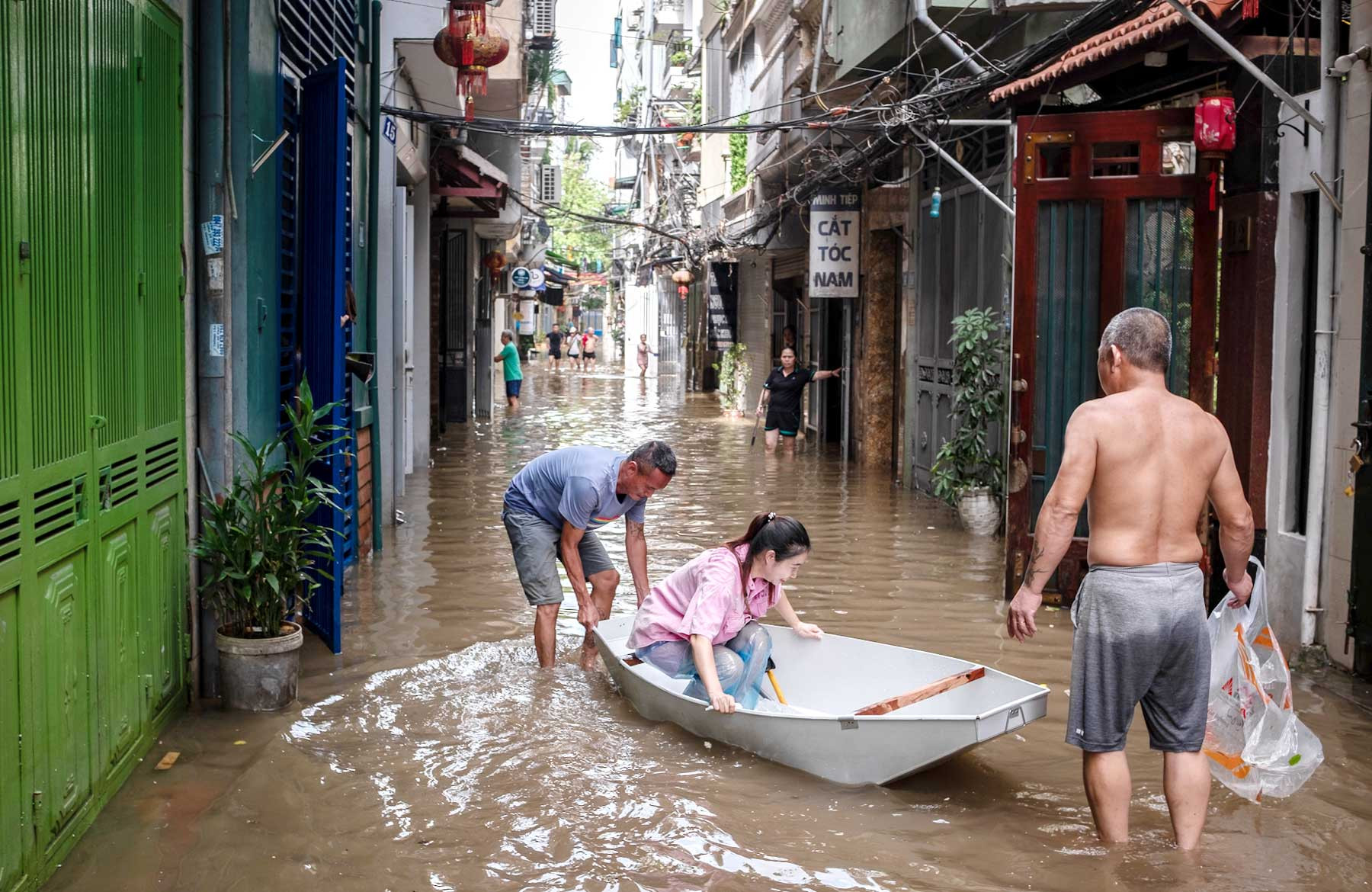 Ngày 12-9, trên nhiều tuyến phố thuộc các phường ven sông Hồng, người dân vẫn phải di chuyển bằng thuyền.
