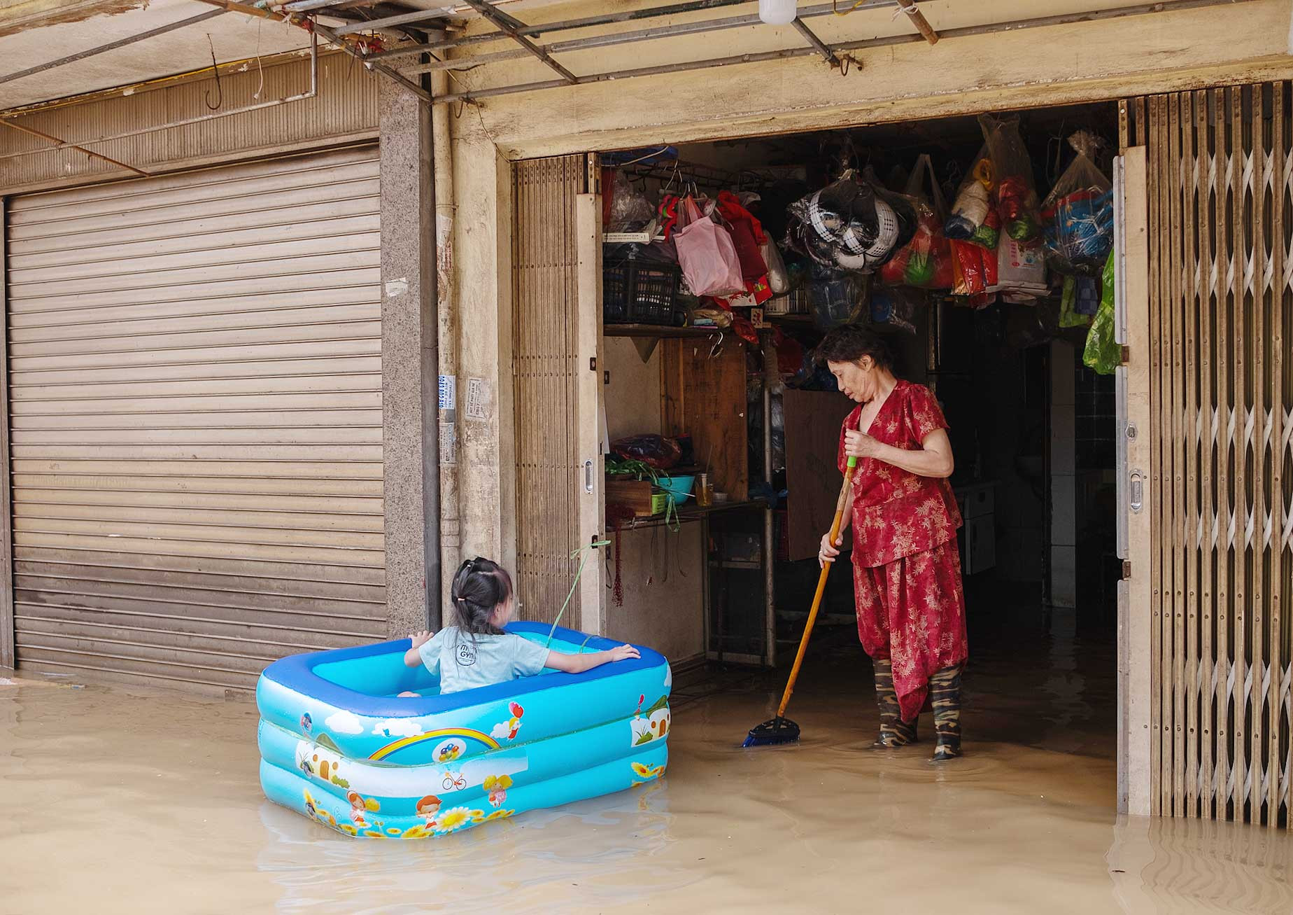 Người dân dần trở lại nhịp sống thường nhật dù nước vẫn ngập cao.
