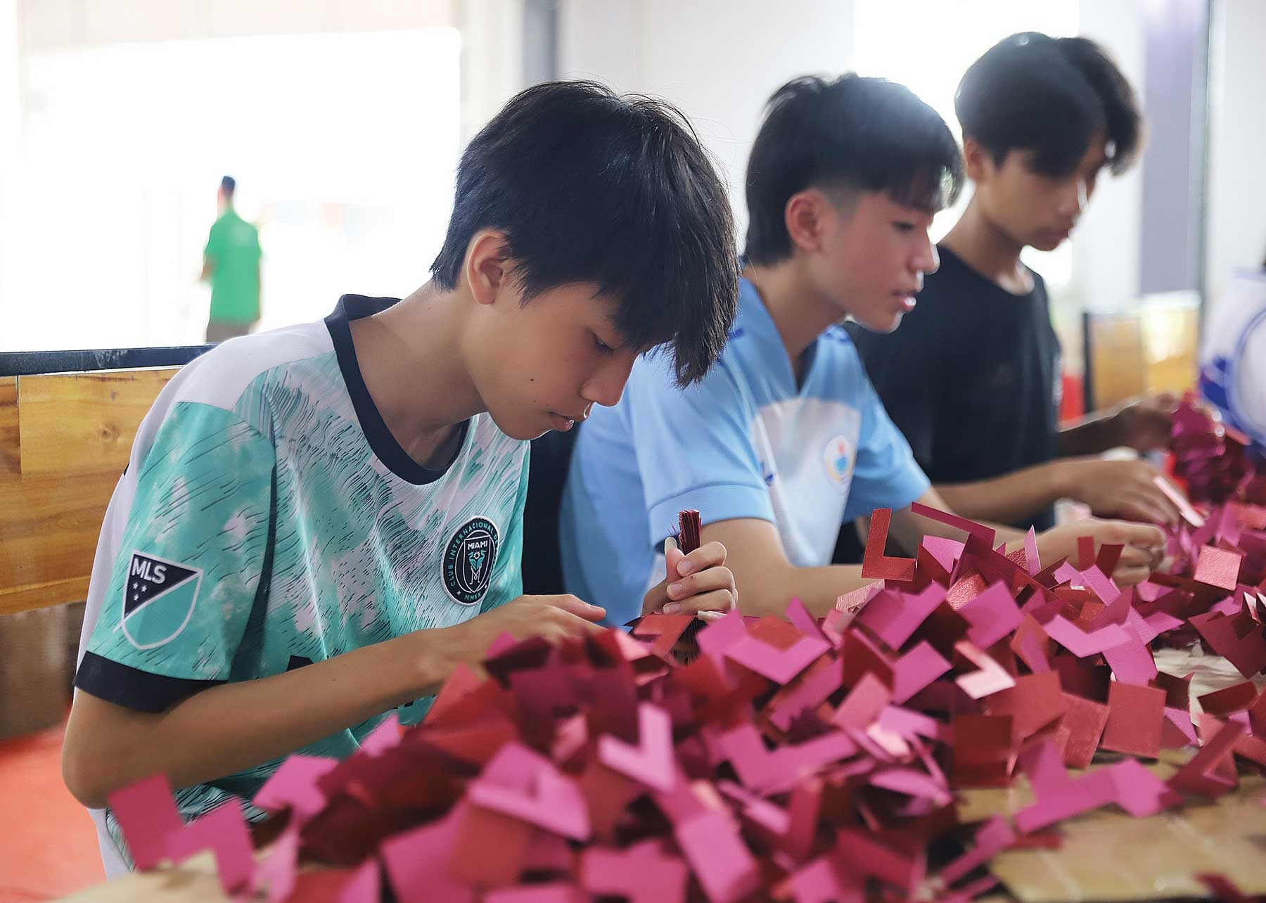 Em Đỗ Anh Quân cùng các bạn học sinh lớp 11, Trường THPT Kim Sơn tham gia trải nghiệm làm phụ kiện các sản phẩm cói.