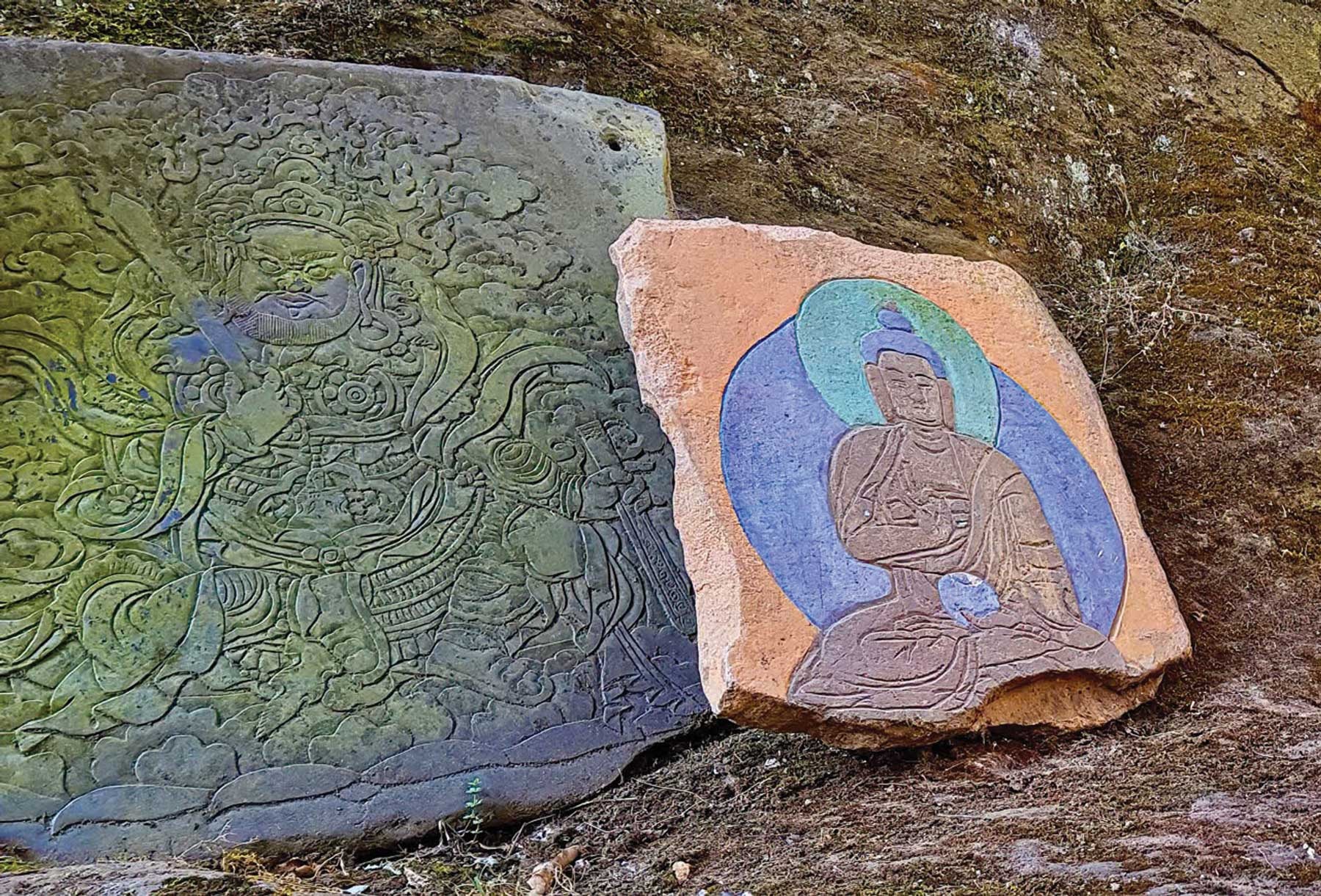 Ở Bhutan, chúng tôi gặp những bức vẽ choán hết cả một sườn núi cũng theo phong cách này. Ở đó, vẽ các vị thần đầy màu sắc, với gương mặt bí ẩn, xung quanh hàng nghìn lá cờ, phướn lộng lẫy xanh đỏ tím vàng tung mình trong gió.