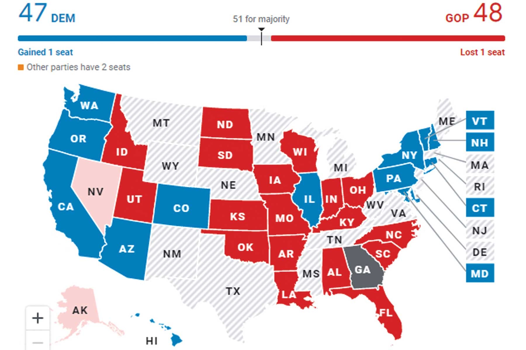 Bản đồ bầu cử giữa kỳ Thượng viện Mỹ năm 2022, với các bang màu đỏ thuộc về Đảng Cộng hòa, xanh - Đảng Dân chủ, vàng - phải đấu vòng tiếp và không màu là bang không tổ chức bầu cử_Ảnh: TL