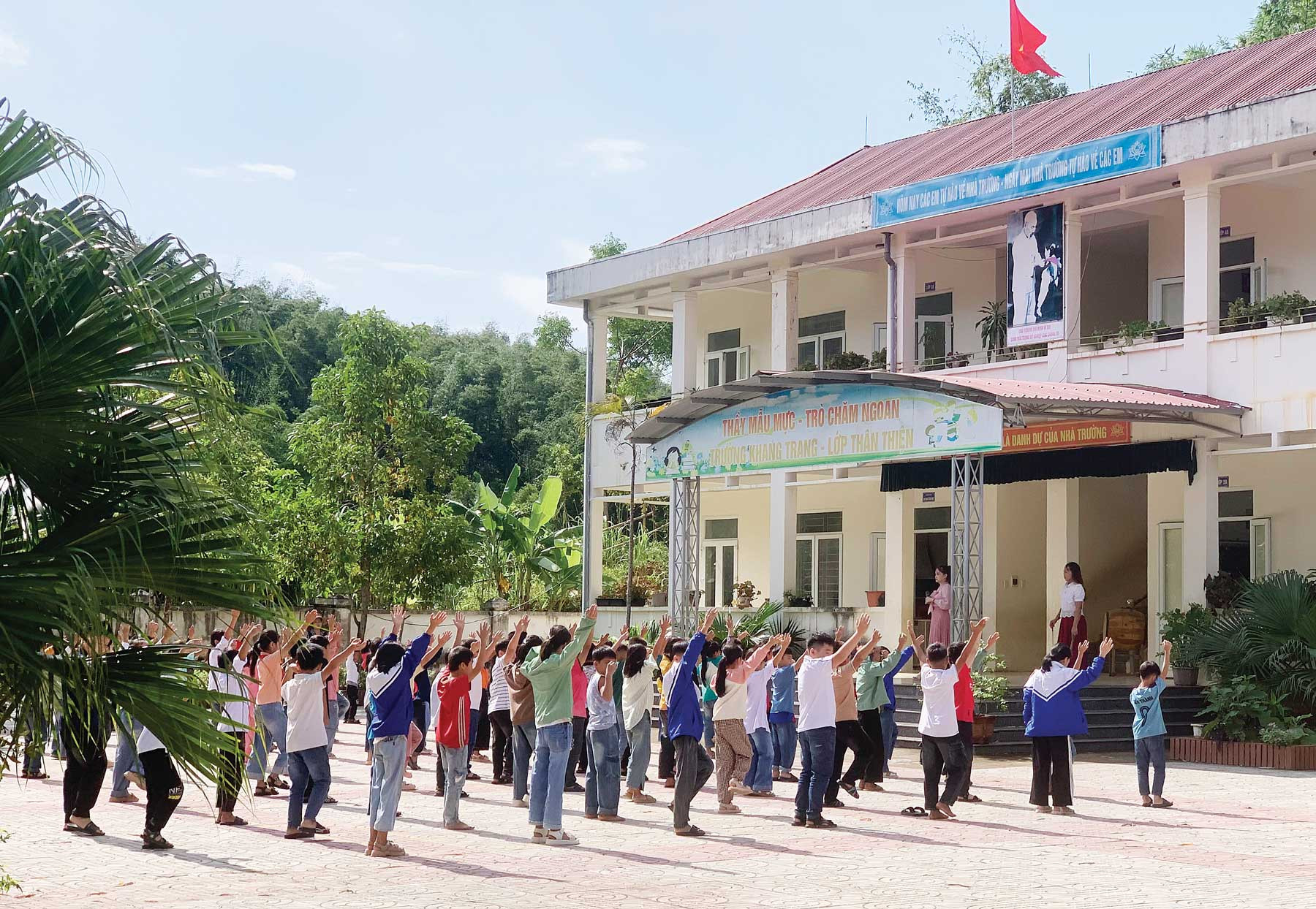 Ít phút sau, học sinh ùa ra sân trường vui chơi rồi tập thể dục. Thầy Viên đứng nhìn các em rồi nhìn về phía bếp, nói: “lát nữa là các em sẽ ăn bữa trưa. Cơm và thức ăn đã được chuẩn bị cả rồi. Vui lắm đấy. Ăn cơm xong, các em ngủ trưa từ 11 giờ 30 đến 13 giờ để học tiếp buổi chiều”.