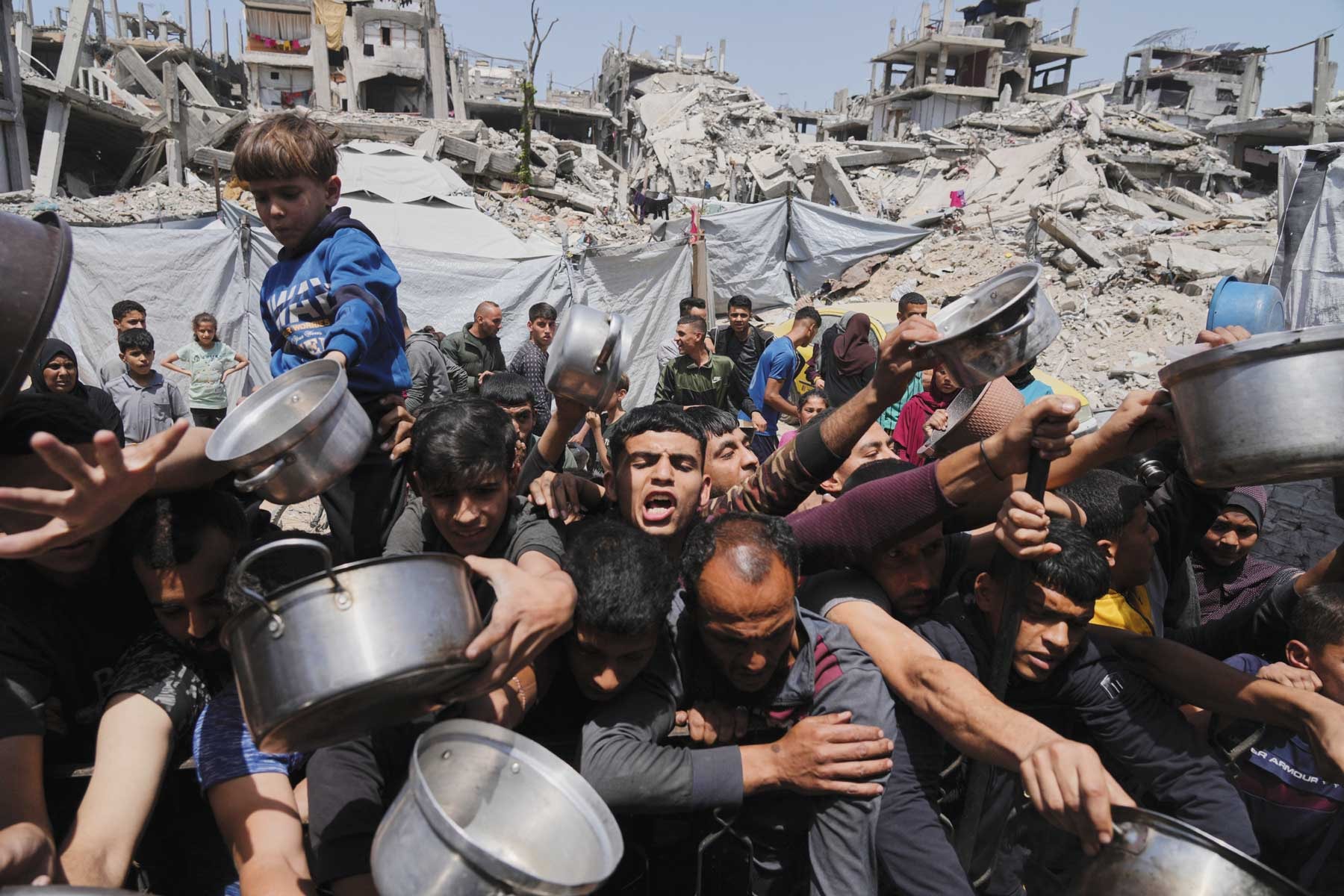 Người dân Palestine nhận thức ăn cứu trợ tại Beit Lahia, phía Bắc Dải Gaza, ngày 3-5-2025_Ảnh: AP