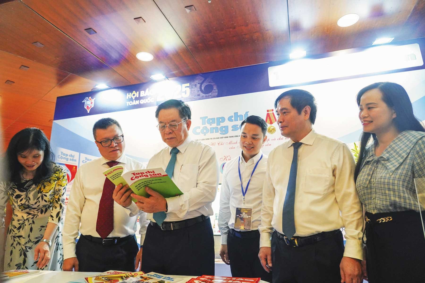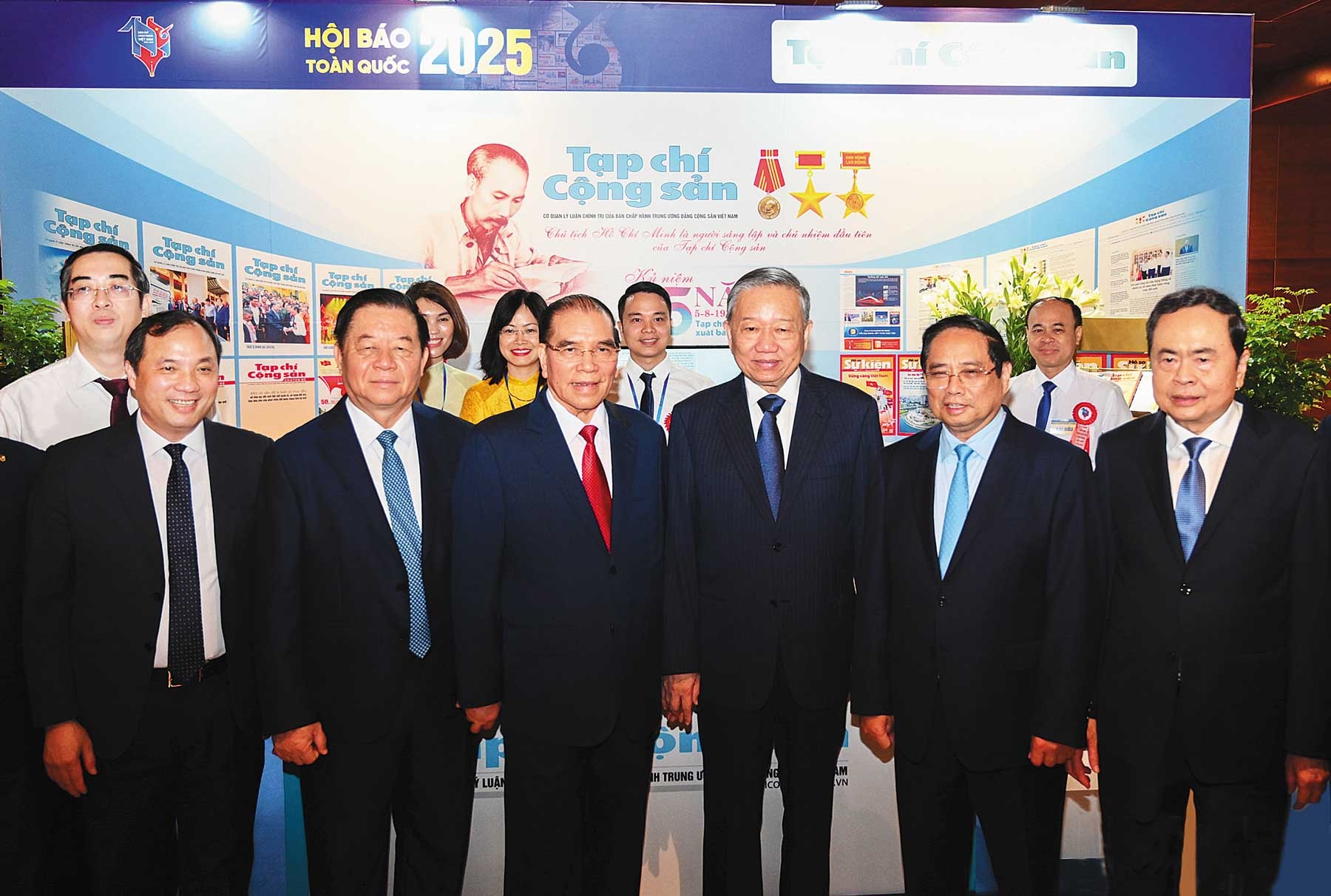Tổng Bí thư Tô Lâm và các đồng chí lãnh đạo Đảng, Nhà nước các đại biểu tham quan gian trưng bày Tạp chí Cộng sản tại Hội báo toàn quốc 2025_Ảnh: nhandan.vn