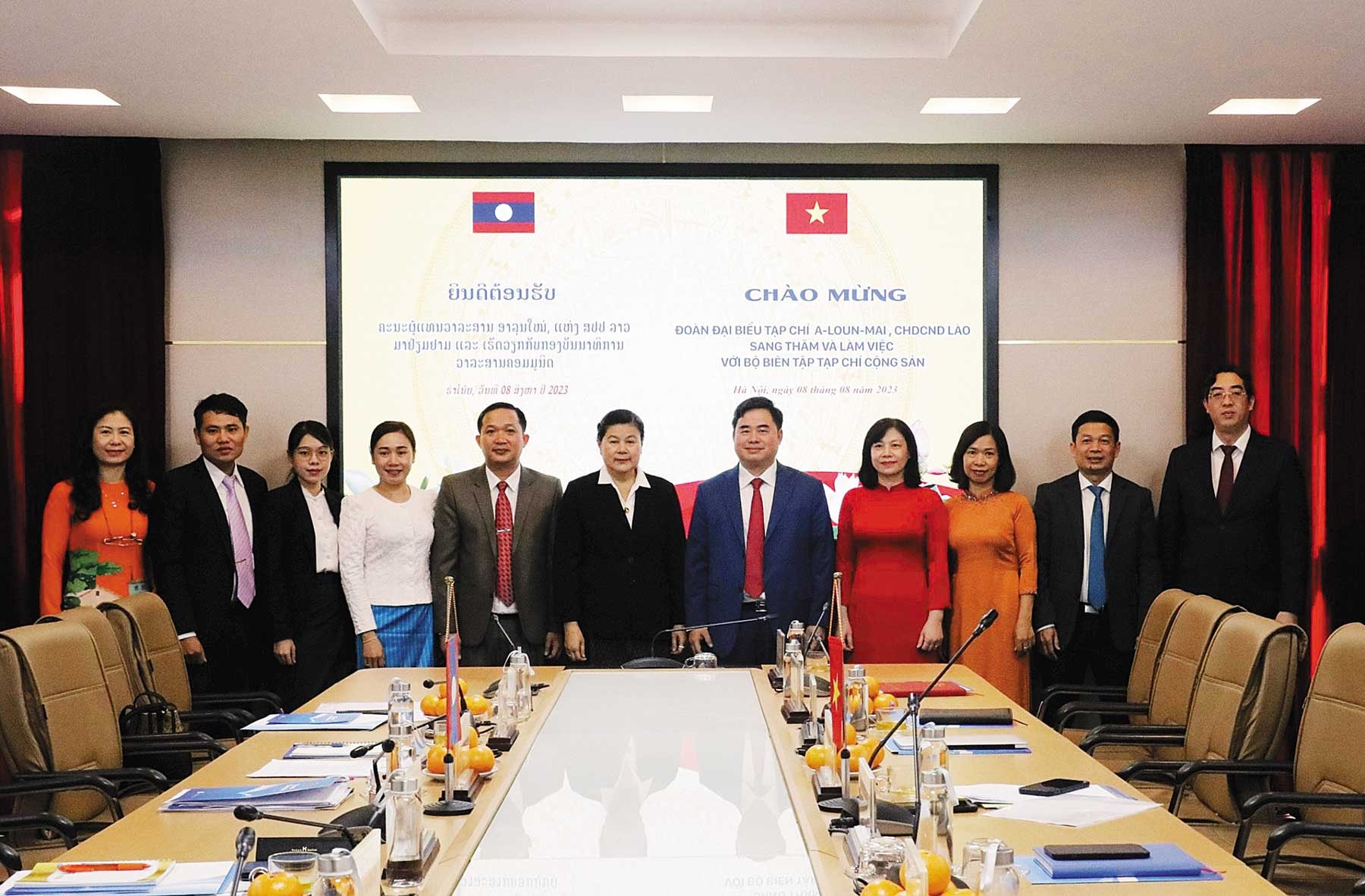 Ban Biên tập Tạp chí Cộng sản đón tiếp và làm việc với Đoàn đại biểu Tạp chí A-lun-may (Lào) tại trụ sở Bộ Biên tập Tạp chí Cộng sản, ngày 8-8-2023_Ảnh: TLTCCS