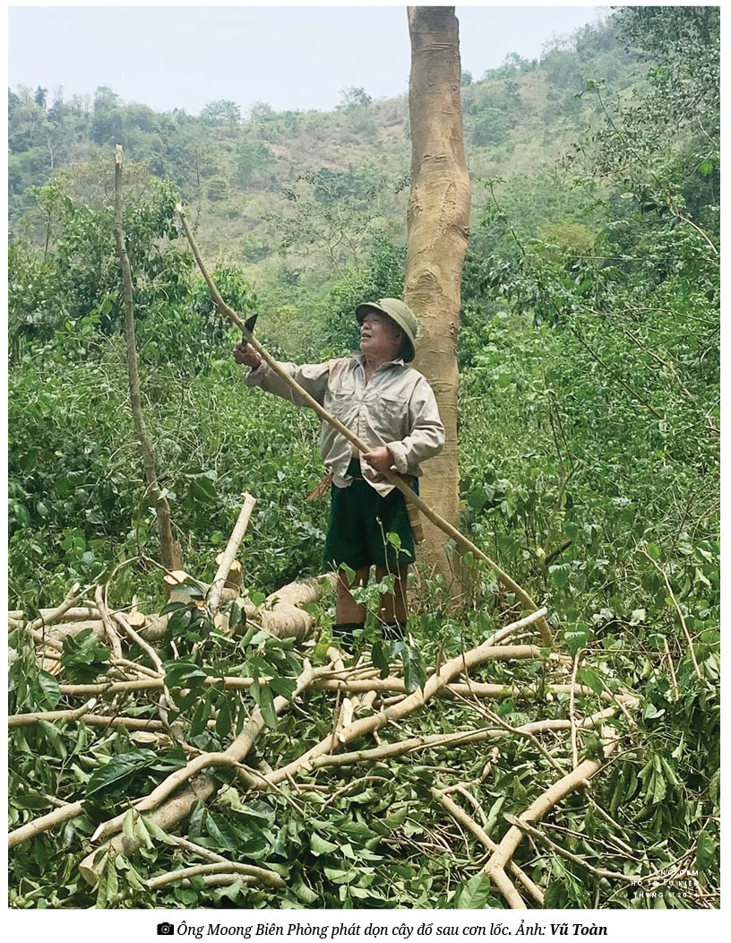 Chúng tôi qua suối, ngược lên núi thấy ông Phòng đang phát dọn cây rừng ngả nghiêng dưới bầu trời oi nắng. Ông Phòng bảo, cơn lốc chiều qua quật gãy không biết bao nhiêu cây cối của La Ngan.