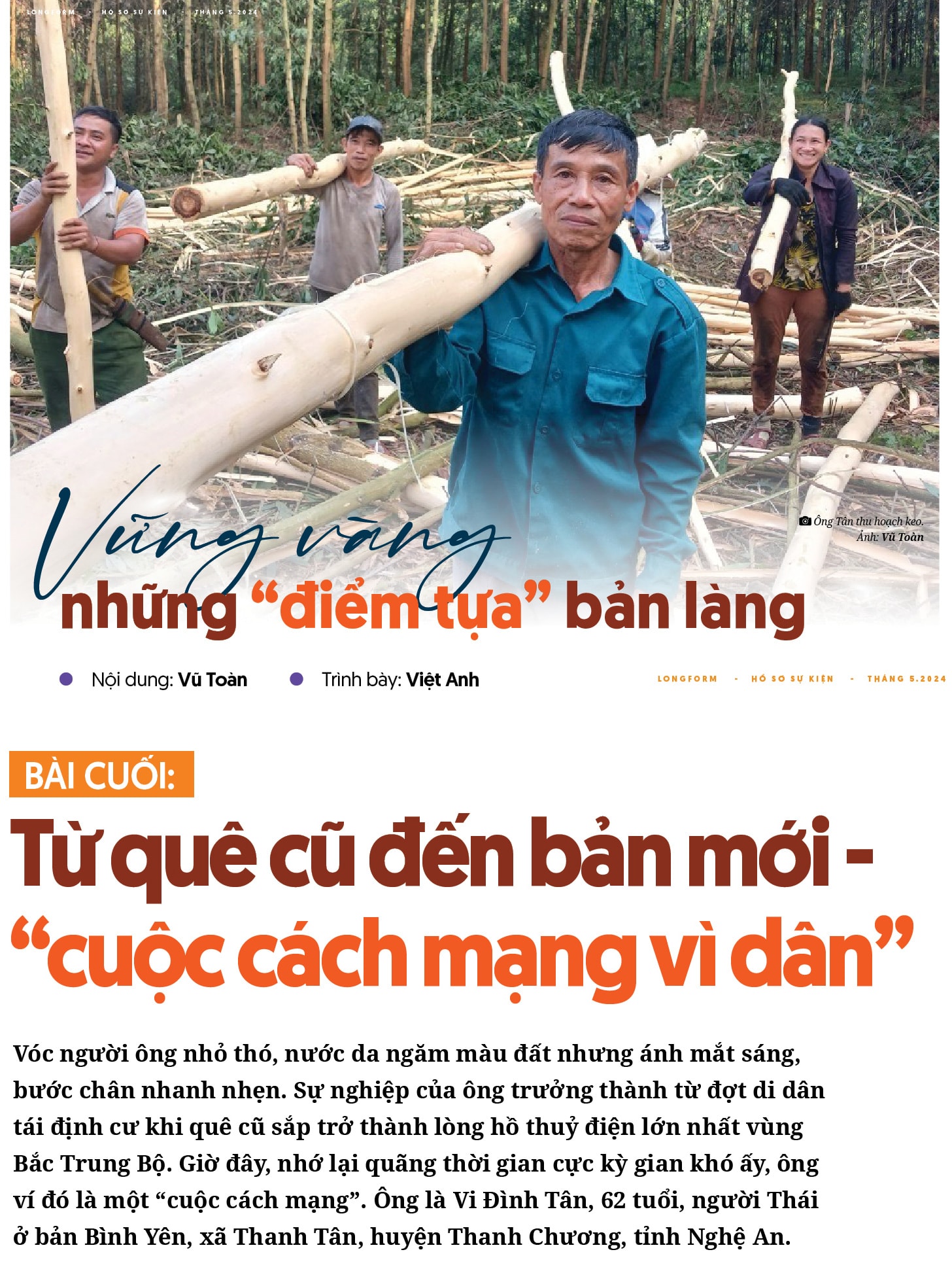 “Ông Vi Đình Tân là thế hệ cán bộ chủ chốt đầu tiên của xã mới Thanh Sơn sau khi tái định cư về huyện. Khi từ quê cũ về khu tái định cư, 6 bản của xã mới phải sáp nhập vào xã Hạnh Lâm, 1 năm sau mới tách ra thành xã Thanh Sơn. Lúc đó, chính quyền xã gặp muôn vàn khó khăn, thử thách, nhất là việc chuyển đổi hình thức sản xuất của dân bản từ cuộc sống dựa vào rừng đến việc trồng lúa nước, trồng chè công nghiệp và cây keo làm nguyên liệu giấy.