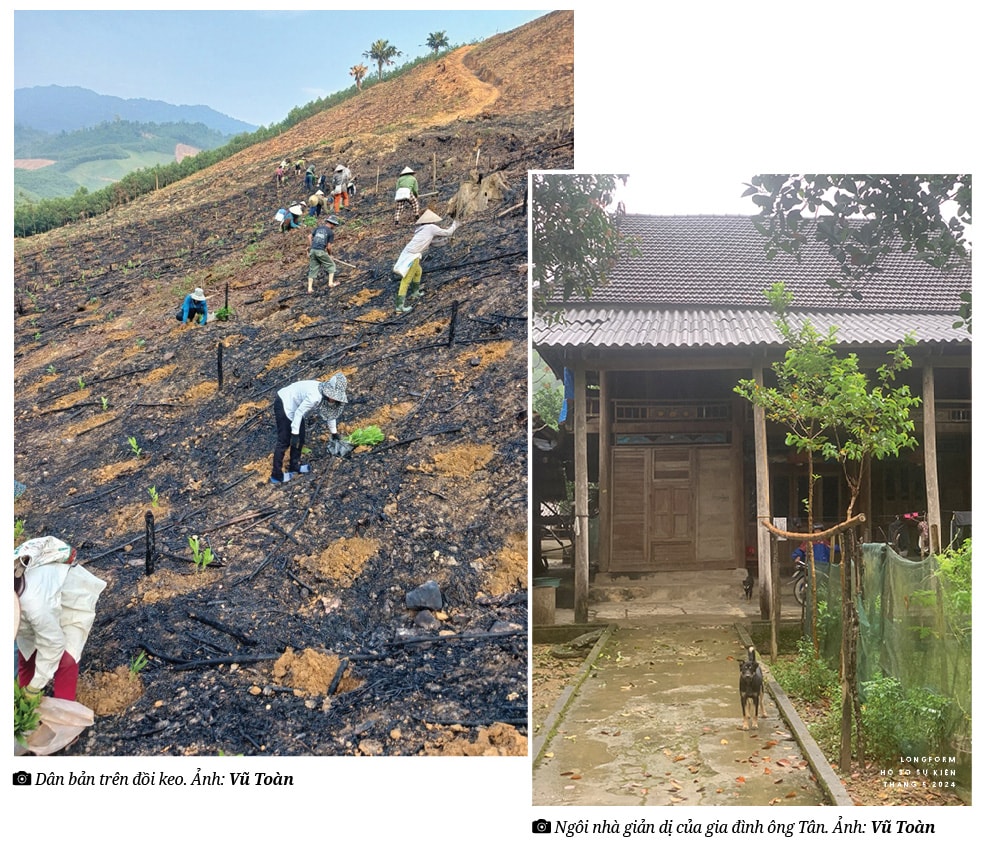 Ông Tân có 2ha đất rừng sản xuất được chia theo tiêu chuẩn tái định cư. Ông thuê thêm 2ha để trồng keo. Ông bảo, xã đang nghèo bởi 1.000 hộ dân nhưng chỉ có 80ha ruộng lúa nước sau khai hoang. Bản Bình Yên của ông chỉ có 8ha/136 hộ gia đình.