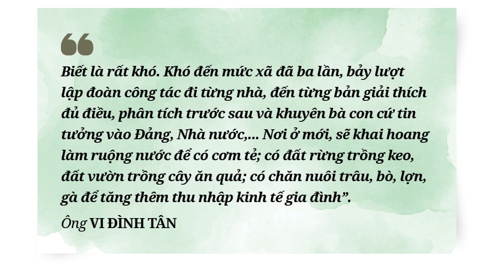 Ông Tân nhớ lại: “biết là rất khó. Khó đến mức xã đã ba lần, bảy lượt lập đoàn công tác đi từng nhà, đến từng bản giải thích đủ điều, phân tích trước sau và khuyên bà con cứ tin tưởng vào Đảng, Nhà nước. Đến nơi ở mới sẽ bằng hoặc tốt hơn nơi ở cũ. Nơi ở cũ, dân bản chỉ biết tỉa lúa trên rẫy dốc để có cơm xôi, bắt con cá dưới khe, bẫy con thú trong rừng. Nơi ở mới, sẽ khai hoang làm ruộng nước để có cơm tẻ; có đất rừng trồng keo, đất vườn trồng cây ăn quả; có chăn nuôi trâu, bò, lợn, gà để tăng thêm thu nhập kinh tế gia đình”.